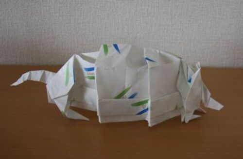 本日チャレンジした折紙作品の紹介です。 ・作品名:アルマジロ ・創作者:ジョセフ・ウー ・折り図掲載:季刊誌「をる」,No.14,1996 ・使用した紙:包装用紙 50cm四方 ・折りあがりサイズ:全長27cm ・制作時間:1時間半