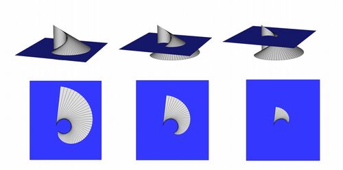 今日の授業で使った教材の一部。以前のエントリで紹介したヘリカル・コンボリュート面。接線曲面の一つで、つるまき線(常螺旋)の接線の集合から成っています。接線曲面なので、平面へ展開可能な曲面(可展面)です。 水平面で切断すると、その切り口はイン…
