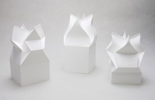 こんな形ができました。 四角い筒の先端部を折ってできる形。牛乳パックの閉じる部分に使えそうな気もします。 (もちろん実際の製造では問題が多いでしょうが。)