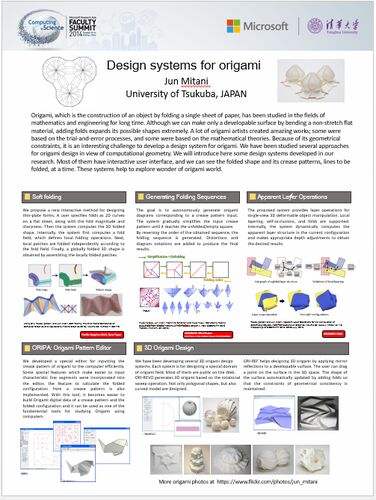 2012年に Microsoft Research より「日本情報学研究賞」をいただいたご縁で、 Microsoft Research Asia Faculty Summit 2014 に招待いただきました。と言っても、参加するだけではなく、ポスター発表(デモ展示)が要請されていて、折紙関係の研究をまとめた…
