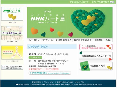 3月3日までの間、日本橋三越本店にて第19回 NHKハート展が行われています。 http://www.nhk-sc.or.jp/heart-pj/art/heart/ 東京での開催をスタートとして、これから全国を巡回する予定のようです。 このNHKハート展とは、障害のある方がつづった詩に託された…