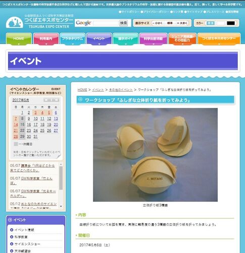 本日、つくばエキスポセンターにて「ふしぎな立体折り紙を折ってみよう」というタイトルでのワークショップを開催しました。 http://www.expocenter.or.jp/?post_type=event&p=26860 午前と午後の2回の開催で、それぞれ1時間。定員は20名で事前申込制。参加…